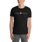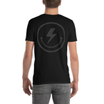 Gun metal grey text on black t-shirt variant. Featuring our smiley on the back.